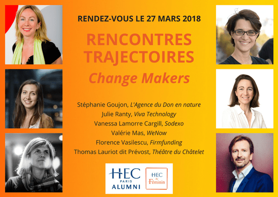 Florence Vasilescu et Thomas Lauriot seront avec Stéphanie Goujon, Valérie Mas, Julie Ranty et Vanessa Lamore Cargill les 6 candidates et candidats « Change-Makers » qui viendront échanger avec vous à notre soirée Trajectoires du 27 Mars. Pour les rencontrer, dialoguer avec eux, comprendre comment ils changent le monde, s’inscrire via la plateforme HEC Alumni. Deux autres rencontres auront lieu les 5 Juin et 25 Septembre. Et si vous êtes vous-même un Change Maker, ou en connaissez que vous souhaitez encourager, les candidatures sont ouvertes jusqu’au 31 Mai 2018 – voir l’appel à candidature.
